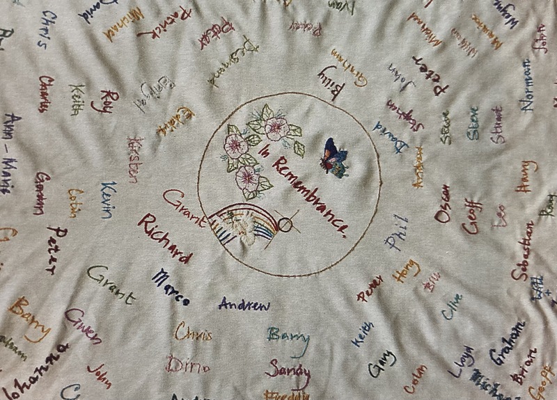 When I had pneumonia and I was bored in hospital someone suggested I do some needlework. I thought about it and decided to embroider a cloth with people’s name on it. That was about four years ago. Now there are 120 or 130 names on it, all people who’ve passed through Open Door at some time. I was classed as a professional funeral goer because I went to nearly all of them, but it’s my way of saying goodbye to friends. I did get to the stage where I thought I couldn’t cry anymore, but then you find that some are really hard. But some have been spiritually uplifting, because nowadays not everyone’s wearing black., quite often everyone wears bright colours. At one of them I went to, we all let off coloured balloons drifting off to heaven. Sometimes I get shaky when I go to funerals, like one last year. I went to someone’s funeral who was called Ken, and it kept going through my mind that it was like my own funeral. It was a strange experience. Sometimes I’m at a funeral and I think back to other people I’ve known…perhaps I hadn’t been able to let go at their funeral so I do at someone else’s. Most of them are younger than me, and often I feel guilty; why am I still going when they have gone? I’ve been told not to think that but I still do. There were three in one day once. It seems to go in cycles. That does get you down a bit.