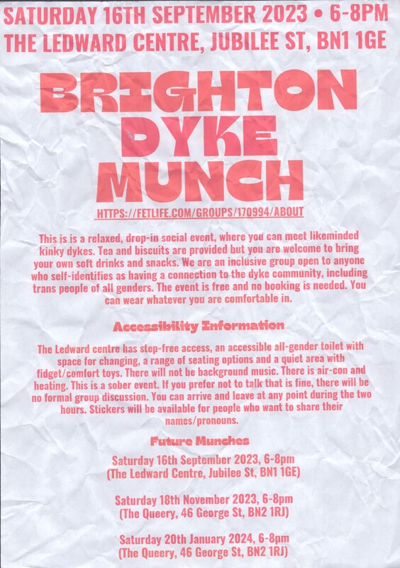 A poster for the first Brighton Dyke Munch, made by me. The poster was displayed at The Ledward Centre in August-September 2023. The munch took place on 16th September 2023. The event was attended by around 40 kinky dykes of all genders, who gathered together to chat over tea and biscuits.