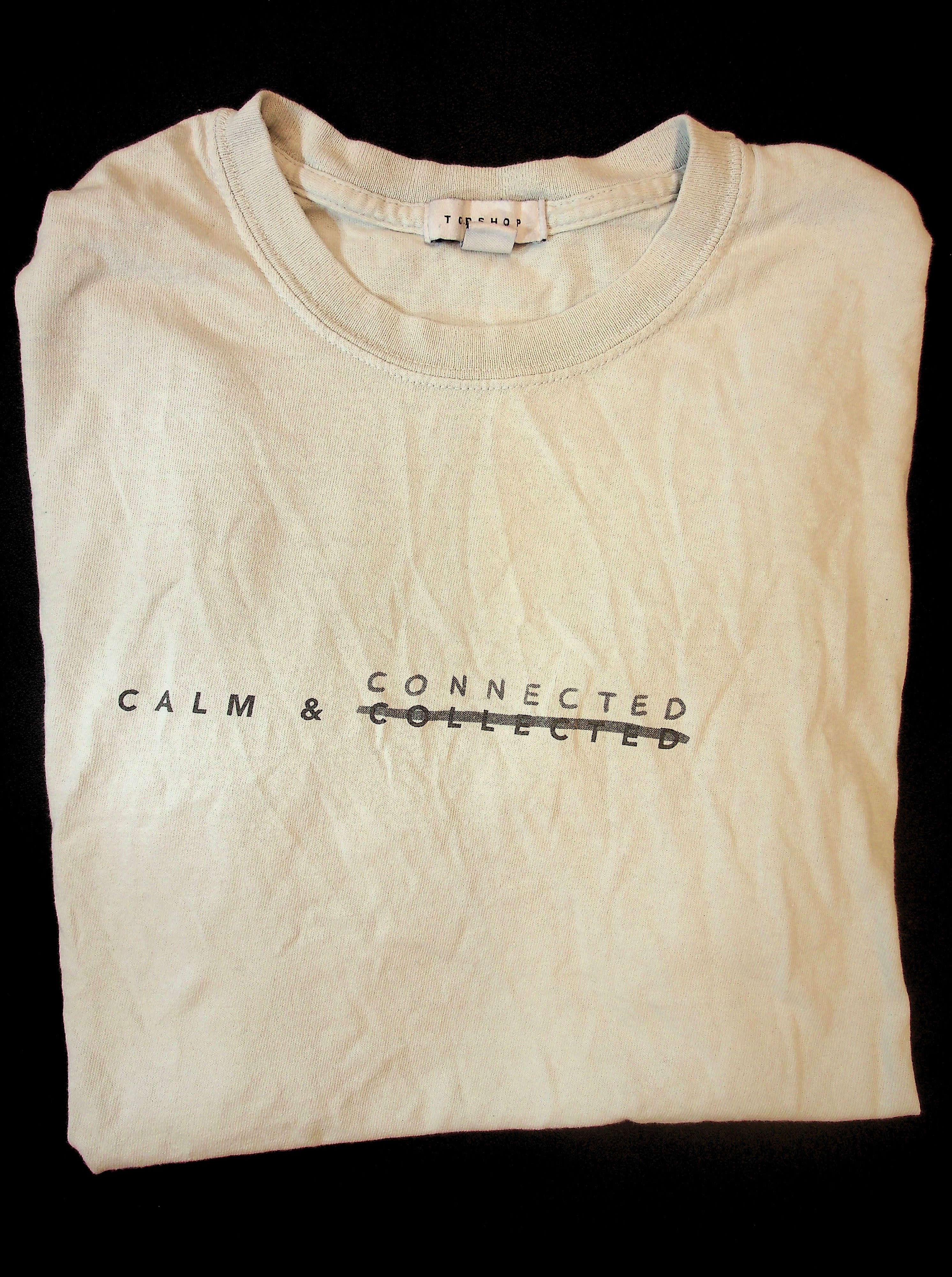 This top was released by Topshop and Topman in collaboration with Calm (Campaign Against Living Miserably) for World Mental Health Day 2019. The front of the T-shirt crosses out the word 'Collected' and writes above it 'Connected'. On the back of the t-shirt, it has instructions on 'how to handle with care', in the format of typical washing instructions. The instructions include information about how to access the CALM helpline. This t-shirt has been a great conversation starter over the years and led to some really important conversations within the community about mental health and access.