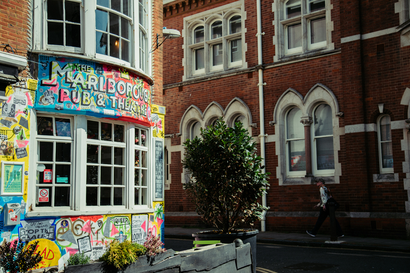 SoundcloudNow we walk down Church Street, past the entrance to Pavilion Gardens, and cross the road towards St James Street. With the wonderful Royal Pavilion on our right, we face into a short slim road: Princes Street. If there is one venue in Brighton that has continuously attracted a queer crowd, over many decades, that would be The Marlborough at 4 Princes Street (now The Actors). The theatre above has a long history of staging entertainment for a select crowd. The pub has been many things over the years – a sanctuary in 1974-75 when it provided rooms for the Sussex Gay Liberation Front and Brighton Campaign for Homosexual Equality to meet in. It was a men’s bar for a brief period 1993-94, and a women’s bar for much longer. In modern times it’s the trans-friendly pub of the area and was the base for organising the UK’s first Trans Pride in 2013.