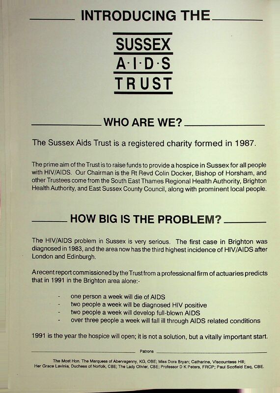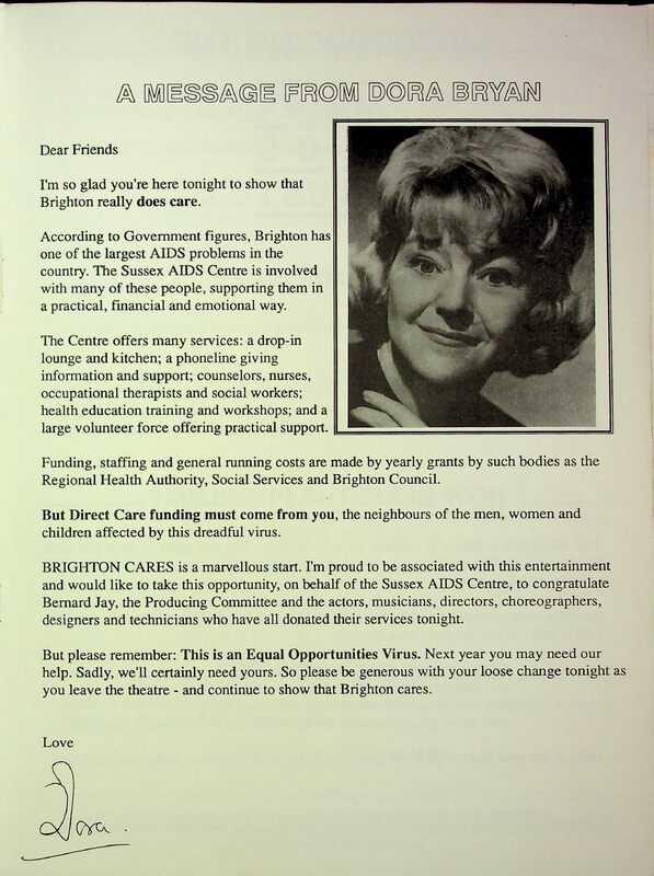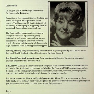 It features advertisements for events, venues, and local businesses, an introduction by Dora Bryan, an introduction to Sussex AIDS Trust, a programme of performances, a list of credits, and a list of volunteers. Separate newspaper cuttings are also present: Divine Cause of the Godfather about Bernard Jay from the Brighton & Hove Leader (18 January 1990) and A Stylish Show for AIDS Sufferers about the Brighton Cares show (source unknown).