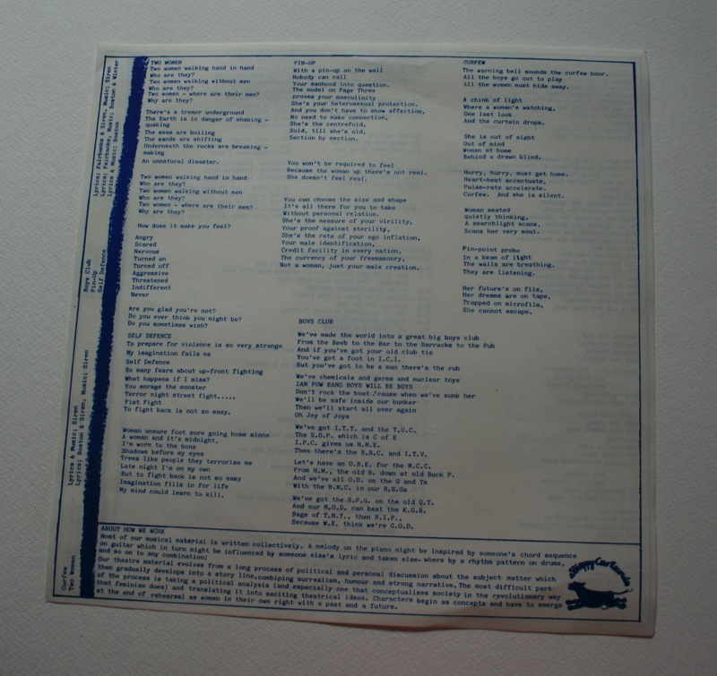 A scanned image set of the Siren Theatre Company 1982 vinyl record and sleeve 'Siren Plays', released by 'Stroppy Cow records’. It shows a list of the inner sleeve with the lyrics of 10 songs composed by various members of Siren and performed by Siren. It also shows photographs of Siren on the back cover, namely Jane Boston guitar, Jude Winter keyboards, Debra Trethewey drums and Tasha Fairbanks saxophone.