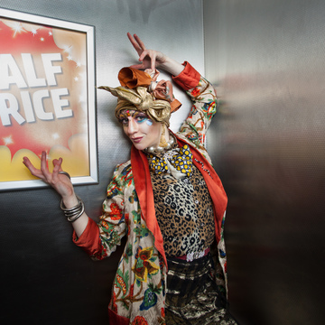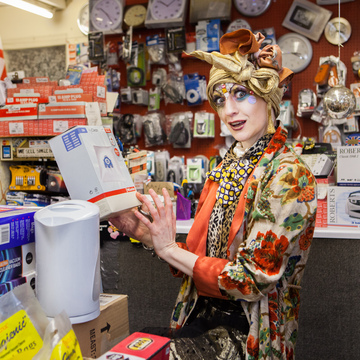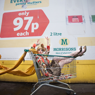 Promotional photoshoot for dance theatre performance 'New Ways of Living' choreographed by Gary Clarke. The photos feature performer Eleanor Perry with makeup inspired by The Bloolips. The photoshoot took place on St James St int he Morrisons lift and carpark, outside the former One Stop Travel Shop and in the electrical retailer Deans.