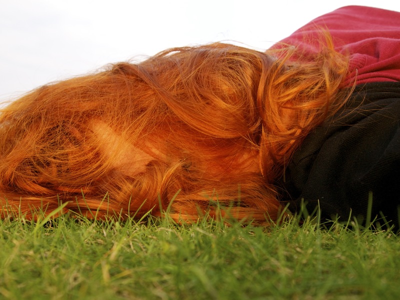 1. This image depicts Sarah lying down in the grass with her hair covering her face.