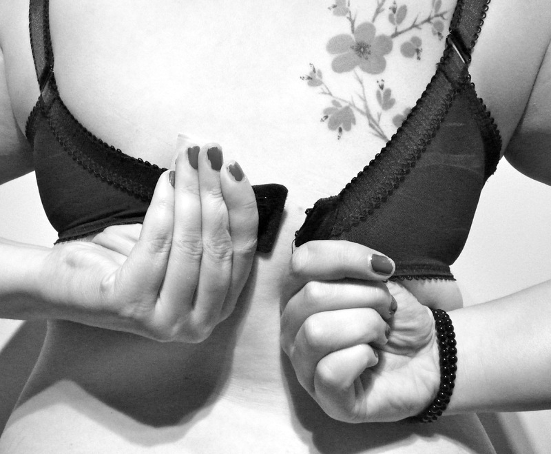 1. This photograph captures someone about to clasp their bra around their back.