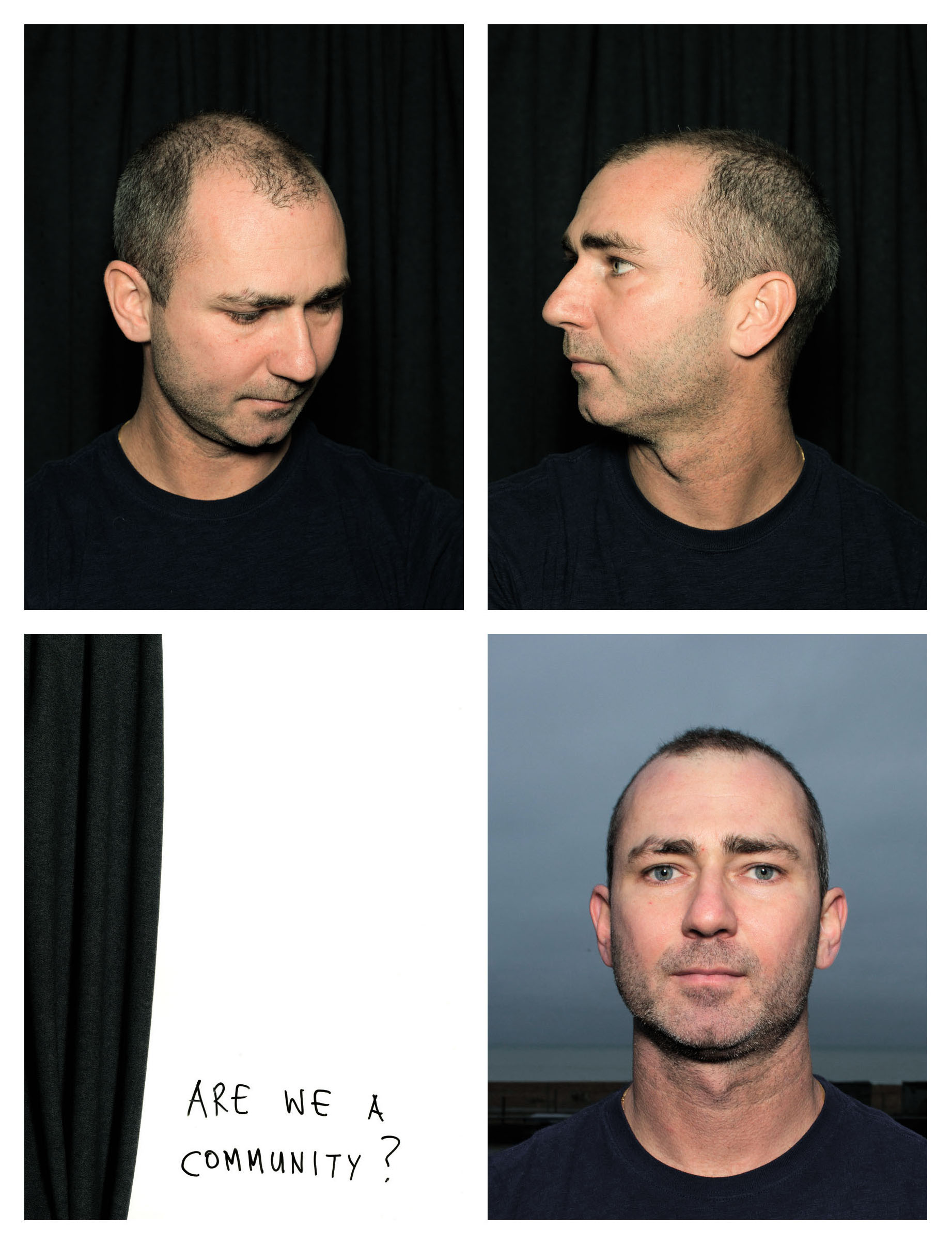 This portrait was created as part of Not Going Shopping in collaboration with Anthony and the 11 participants. It is composed of two self portraits taken in a photobooth, a written note by the subject of the portrait, and a portrait taken at Brighton Seafront (bottom right). Anthony's written note reads "ARE WE A COMMUNITY?"
