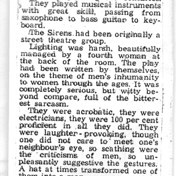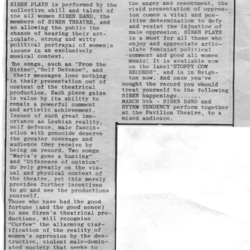 The review is positive about Siren’s first album “Siren Plays’, praising their "articulate, strong and witty political portrayal of women's issues in an exclusively musical context."
