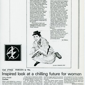 Two reviews about the play ‘Curfew’ when it opened at the Oval House Theatre, London. The review at the top of the image is from 'Spare Rib', published in March 1982. It features a photo of Jane Boston as Calamity Jane. The review at the bottom of the photo is from 'The Stage', published in February 1982.