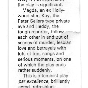 The reviewer, Liz Horsfield, writes that Lily is far more interested in Ruby [or}“is it me being a lesbian that makes me think so?” No matter how ‘out’ Siren was as a company, it perhaps wasn’t always obvious to the audience or reviewers.