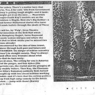 Bardsley writes that "Siren have always been mesmerised by the idea of time travel, they move their performances through both past and future and around a central theme of DANGER: the danger of lesbian sexuality (and of any kind of 'otherness') to straight society."