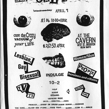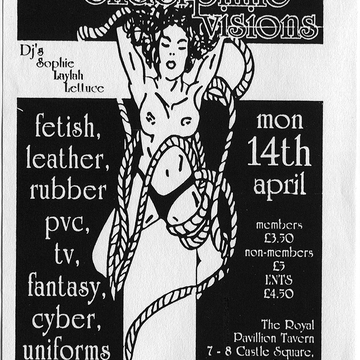 Club flyer for 'endorphine visions' at The Royal Pavilion Tavern, 7–8 Castle Square in Brighton on Monday 14 April 1997. Djs: Sophie, Laylah, Lettuce. Fetish, leather, rubber, pvc, tv, fantasy, cyber, uniforms.