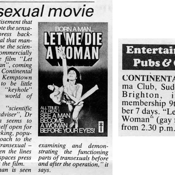 A small feature piece 'Transexual movie' advertising a screening of the film 'Let Me Die A Woman' at Brighton's Continentale Cinema, Sudeley Place, 9 December 1982. This and the accompanying listing come from Issue 2 of The Lavender Letter - courtesy of the Bishopsgate Institute.