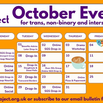 The Clare Project is a Brighton-based charity, supporting trans, non-binary and intersex adults. This image was created by me in September 2024 for sharing on the charity's social media (Facebook and Instagram). The design is in a calendar format, with listings of the charity's events by date.